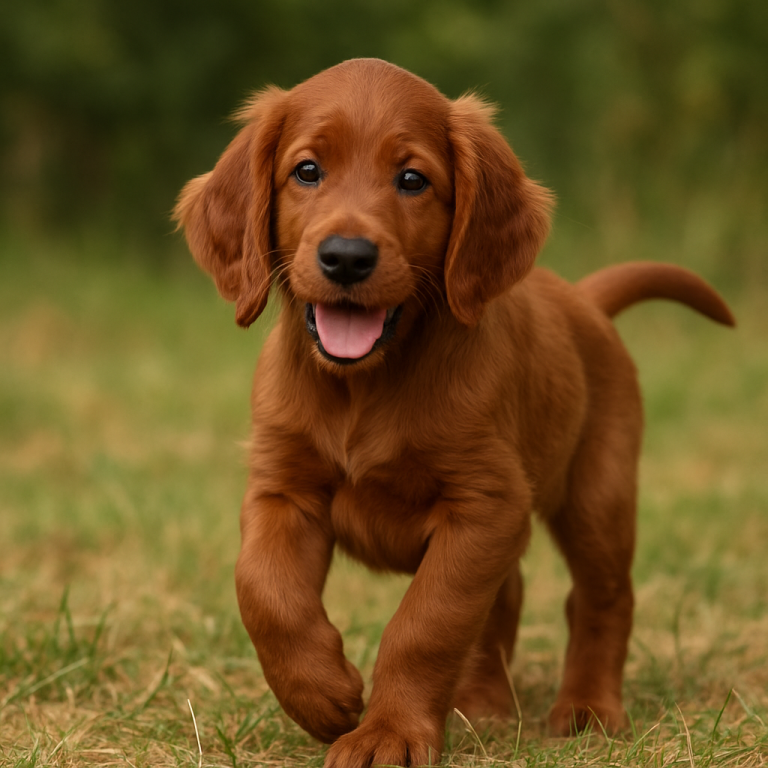 Der Irish Setter ist ein eleganter, temperamentvoller und freundlicher Jagdhund mit auffälligem rot glänzendem Fell. Er ist voller Energie, sehr menschenbezogen und liebt es, in Bewegung zu sein. Ein Irish Setter-Welpe ist verspielt, neugierig und ausgesprochen verschmust – gleichzeitig braucht er viel Geduld, klare Erziehung und ausreichend Beschäftigung.